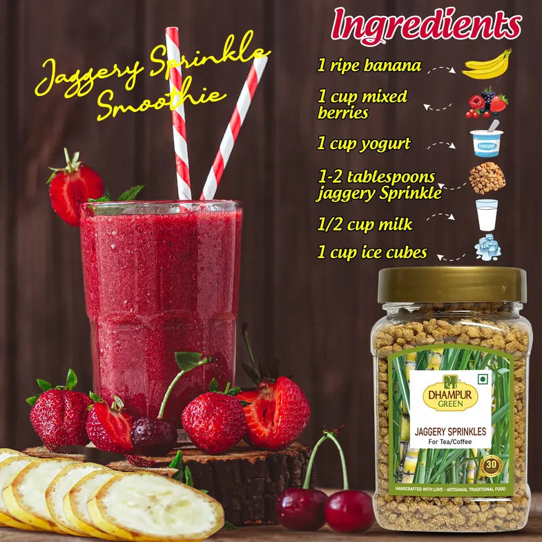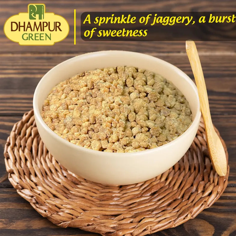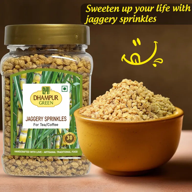 Dhampur Green Jaggery Sprinkles, delicious jaggery crystals that bring a touch of sweetness to your culinary creations. Derived from sugarcane, these sprinkles offer a convenient and versatile way to sweeten your dishes with the richness of molasses-like essence. Jaggery Sprinkles are a healthier alternative to refined sugar, retaining the nutrients and minerals present in jaggery. The sprinkle form allows for easy usage, making them an ideal choice for adding sweetness to various foods and beverages. Sprinkle these jaggery crystals into your morning tea or coffee for a delightful molasses undertone. Elevate the gustatory of your oatmeal, cereals, or yogurt by incorporating a touch of Jaggery Sprinkles. Use them in baking recipes to infuse cookies, muffins, or cakes with the unique taste profile of jaggery. Beyond beverages and baking, Jaggery Sprinkles serve as a versatile topping for salads, fruits, and toast. Create a wholesome trail mix by combining them with nuts and seeds or use them to rim cocktail glasses for a delightful and elegant touch.