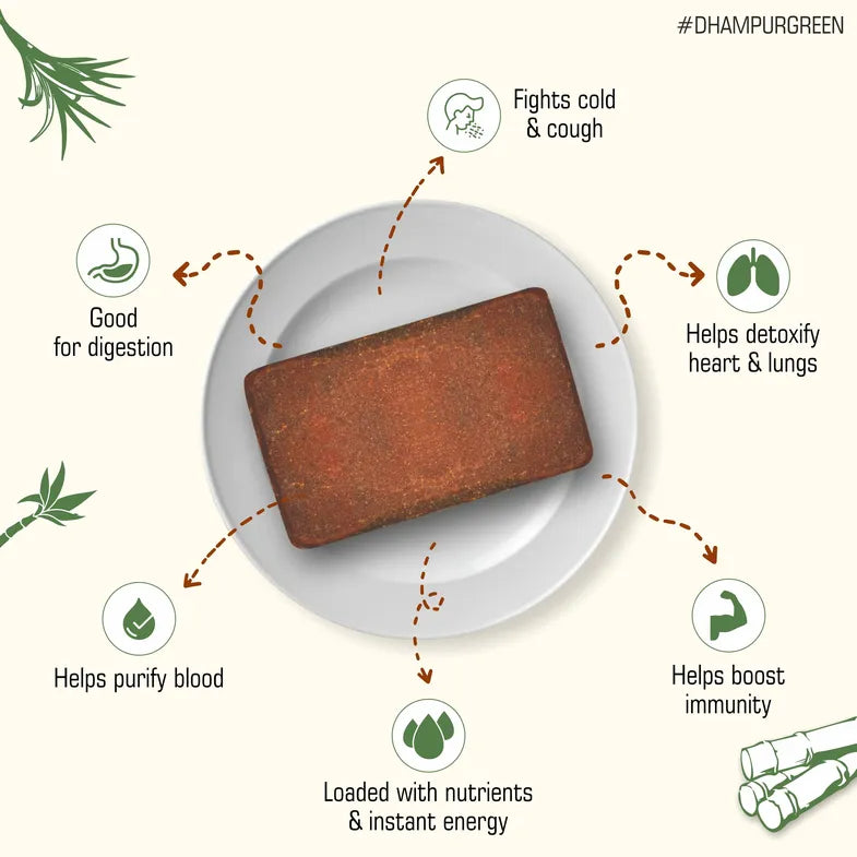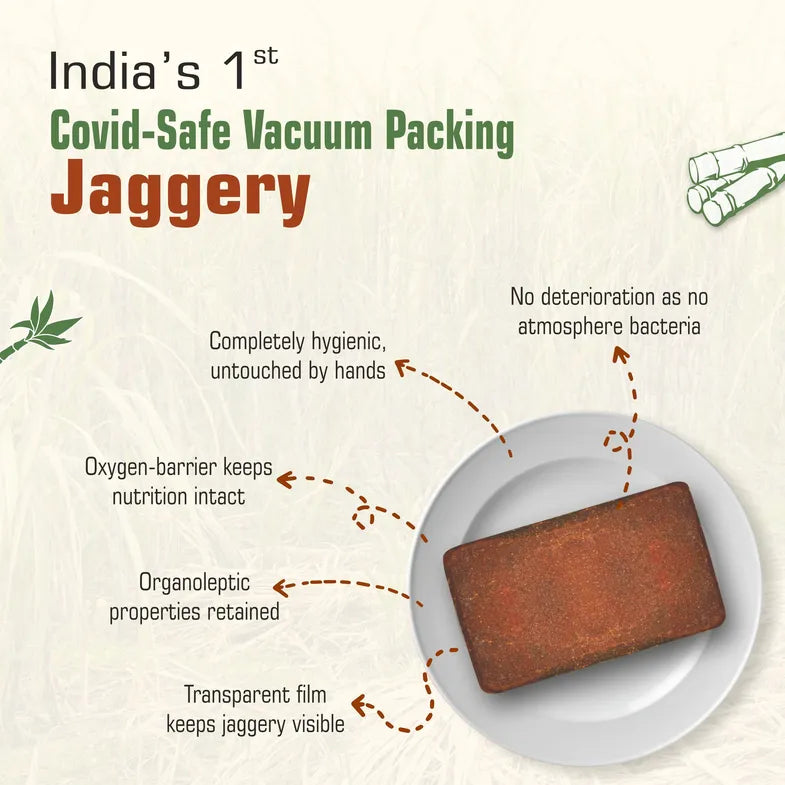 India’s first vacuum-packed Jaggery with extended shelf life, reduced product loss, having sealed barrier from external elements, which retains the delicious savor and goodness of the jaggery. Add in your cooking to make gur mithais, sweets, sherbets, snacks, brittles, payasam, and more with it, or enjoy on your parantha, toast, oatmeal, cereal, tea, coffee, or just have a bite after meals. Net weight - 1000 grams, Vacuum packed and organic Jaggery; golden brown to dark brown, (similar to the Latin-American panela); store in the refrigerator. Gur/ Gud/ Jaggery is known to have several health benefits e.g. it prevents constipation by aiding digestion; acts as a detox by helping cleanse the liver by flushing out nasty toxins from the body; is a source of antioxidants and minerals like zinc and selenium that help prevent free-radicals (responsible for early aging) damage, and much more.