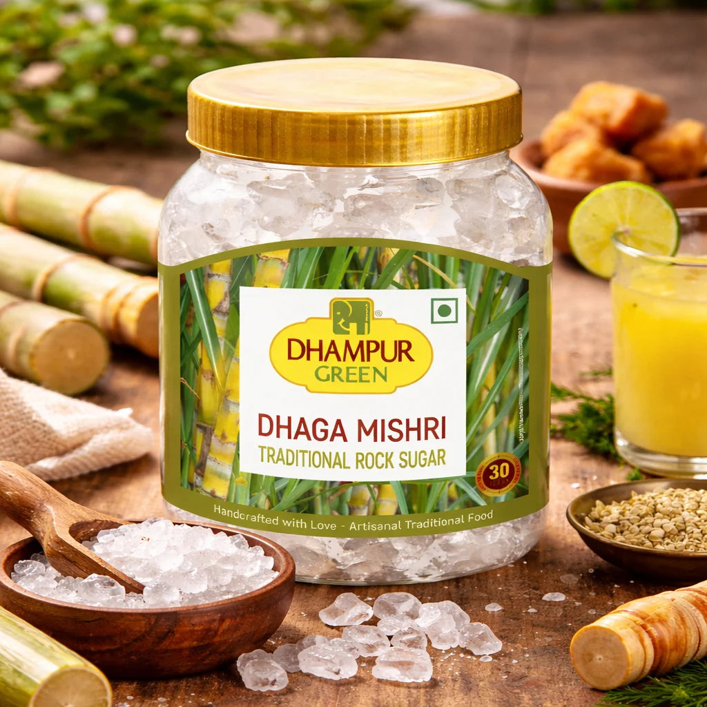 Mishri is one of those things that most Indians have a specific memory attached to. A piece offered after a pooja. A chunk dropped into a glass of warm milk at night. A small crystal placed on the tongue as a child, that slow, clean dissolve that felt like a different kind of sweet from anything else. Dhampur Green Dhaga Mishri is traditional rock sugar — handcrafted, artisanal, made from pure cane sugar — the same mishri that has been part of Indian homes, temples, and kitchens for as long as anyone can remember. The kind on a string (dhaga), crystallised slowly the old way, in a 750g jar that keeps it clean and fresh and ready to use.