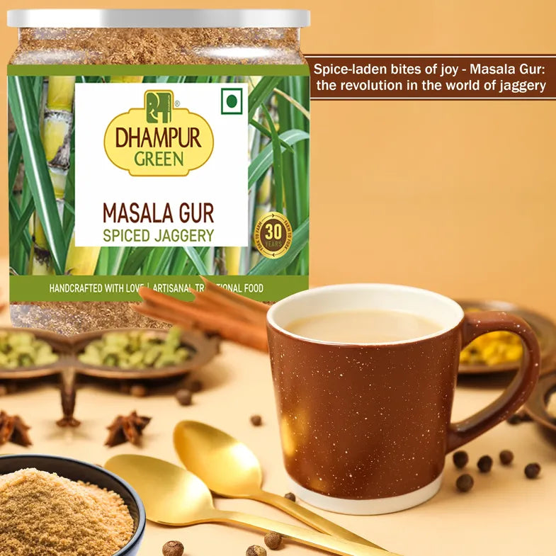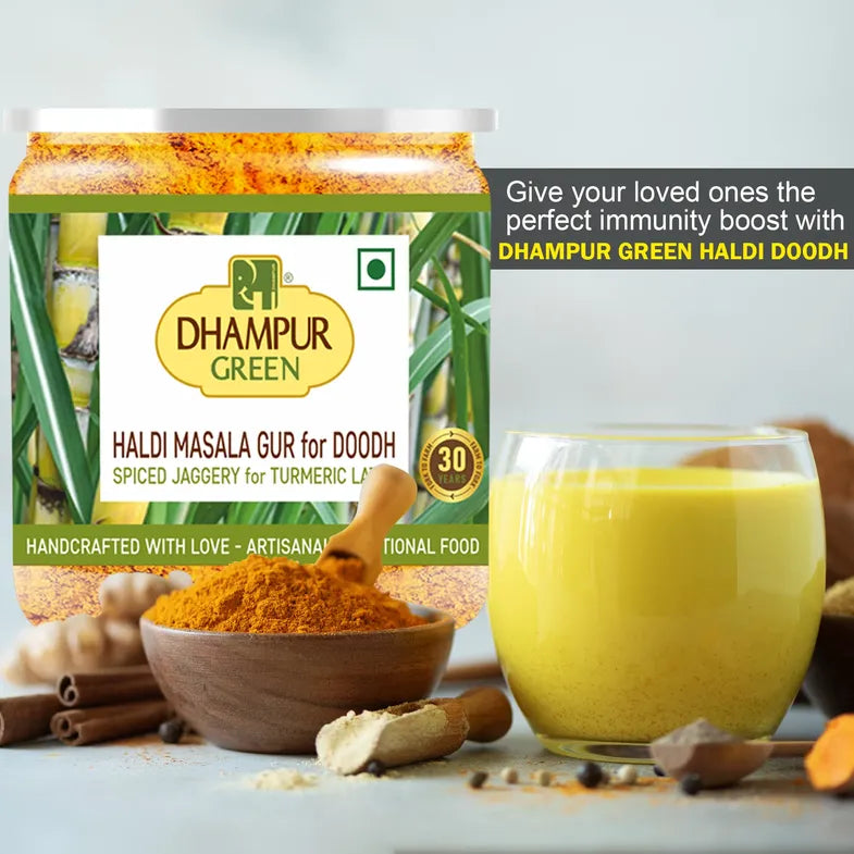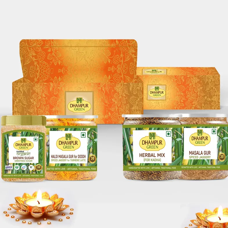 Dhampur Green Organic Brown Sugar, Haldi Masala Doodh, Herbal Infusion Kadha & Masala Gur with Organic Jaggery Combo is a diverse collection of products that bring together the goodness of jaggery and a variety of spices and herbal ingredients.