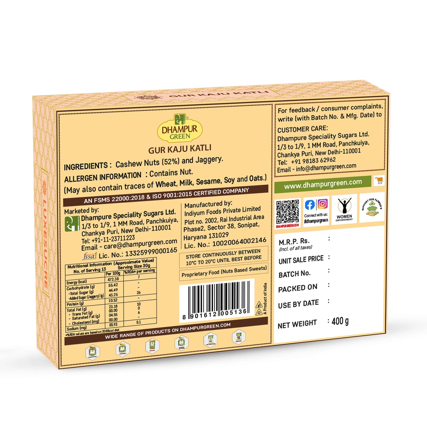 Dhampur Green Gur Kaju Katli is a delectable treat that combines the rich sweetness of jaggery with the nutty goodness of cashews. Crafted with care, this Gur Kaju Katli 400gm pack offers an irresistible blend of flavors that is sure to elevate your snacking experience.