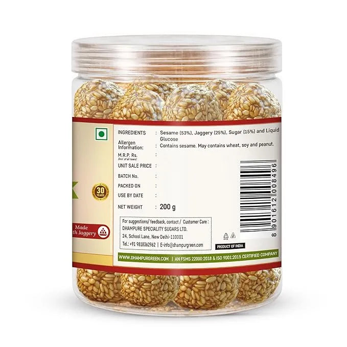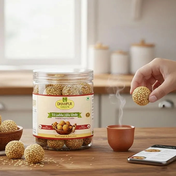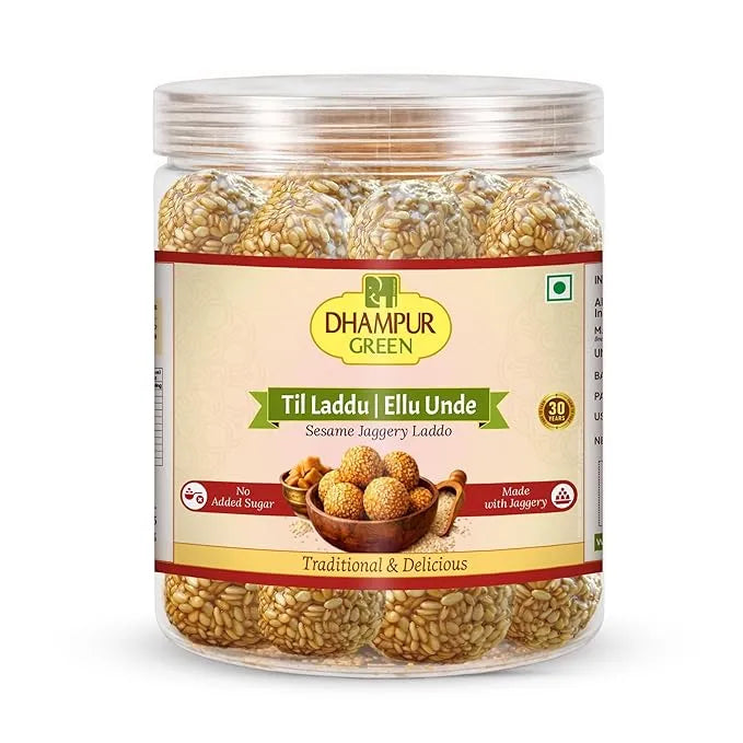 Festive Delicacy: Elevate your festive celebrations with Dhampur Green's Sesame Jaggery Laddu, a confection that brings the joy of tradition to your special occasions.